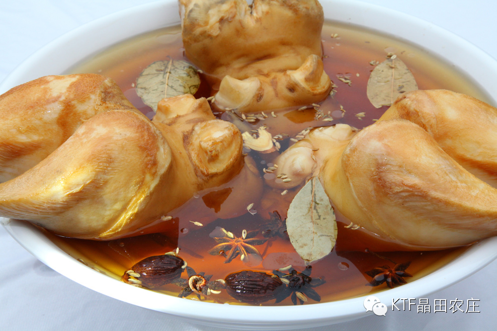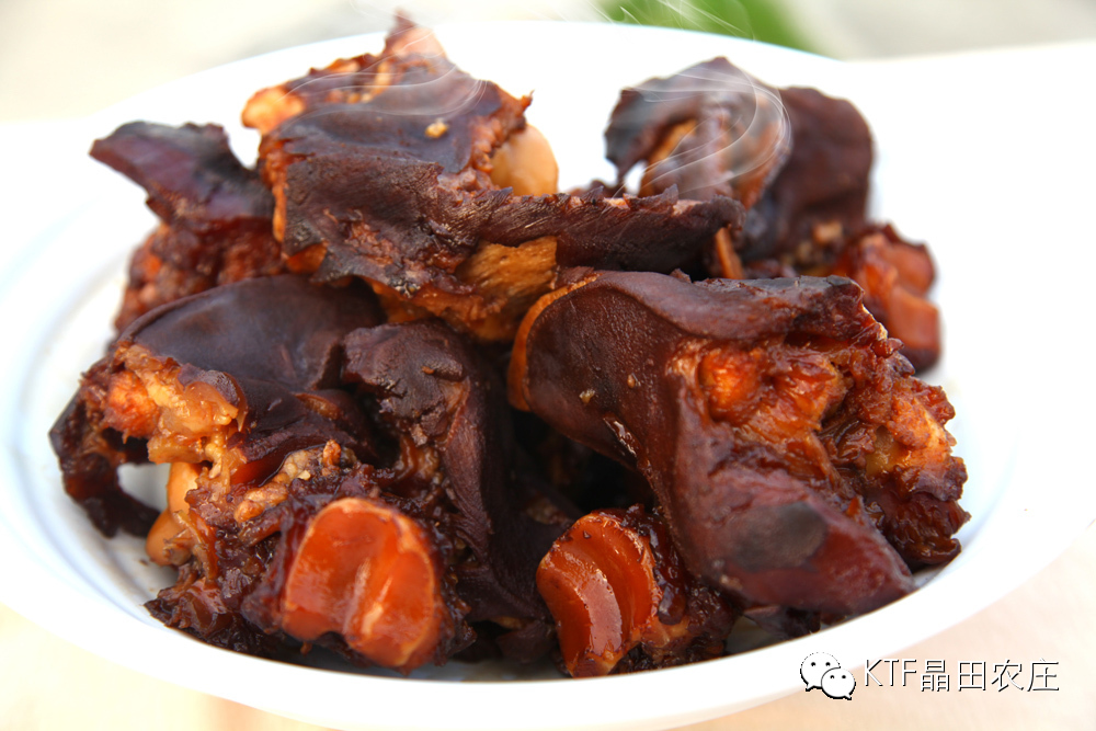 牛蹄(韬哥喜遇牛蹄套餐) 牛蹄含有丰富的骨胶原,喺女人嘅美容食品,牛蹄15年前食过、后因太过肥腻冇再试过,广东极小食肆将牛蹄做成美食,原因好难解决肥腻嘅问题,今日同朋友来晶田农荘嘅试食晚餐,晚餐嘅主角喺牛蹄,为咗比面、免强切小小试下,当点上西式嘅黑椒汁,入口嘅牛蹄好爽、野味嘅黑椒汁,黑椒汁有微棘嘅儿童板,食后再加块陈醋萝卜皮,牛蹄同黒椒汁味道好夹.陈醋萝卜皮同牛蹄嘅搭配好健康,哗!简直喺人间嘅极品,用锯排、刀叉嘅西式食法,好快一只牛蹄比我食晒,15年前半只都食唔晒,吚次我好有兴趣问大厨,先至明白其中秘密: 用干稻草起火将牛蹄烧5分钟,用刀撞甩牛蹄壳、再用稻火慢烧5分钟,重复稻火慢烧嘅主要目的喺消除牛蹄入面多余嘅脂肪,从而增强牛蹄的爽脆度,然后飞水。 将牛蹄用竹萝装好放入有冲击流的山泉水啤一个晚上、目的让牛蹄的纤维收紧,噉样牛蹄嘅口感更爽更脆,又可以去除牛膻味。 再将煲好的药材卤水和牛蹄放入冰柜吸味一个晚上、三日二夜的制作工艺终于大功告成。 美味嘅背后完全喺食工夫。 中国嘅牛蹄,传统中式的烹饪,西式的吃法又爽又脆的口感,看客人好享受嘅表情就知道牛蹄喺唔喺LV级嘅品 质。 食后再加块 级的陈醋萝卜皮,牛蹄同黒椒汁味道好夹.陈醋萝卜皮同牛蹄嘅搭配好健康,哗!简直喺人间嘅极品。 奔驰级的排骨腊味煎饭 宝马级的菠萝包 拉菲级的牛尾炖汤 韬哥用红酒杯来享受清炖牛尾汤 汤色好清,牛肉味好浓,又够清甜,冇牛膻味。