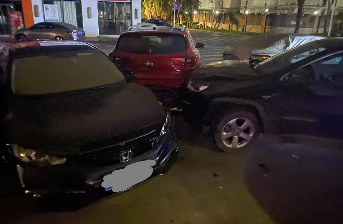 御园小区御景豪庭路口,凌晨时分发生多车被撞。