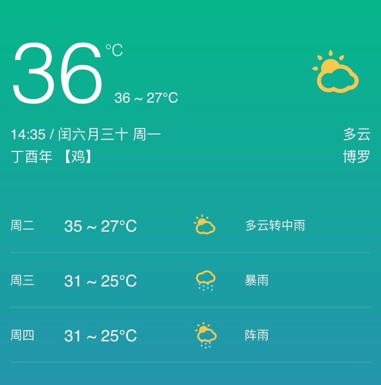 园洲这几天的天气 可谓是热死人的节奏 让我们打开【罗浮圈APP】 看看今天的温度: