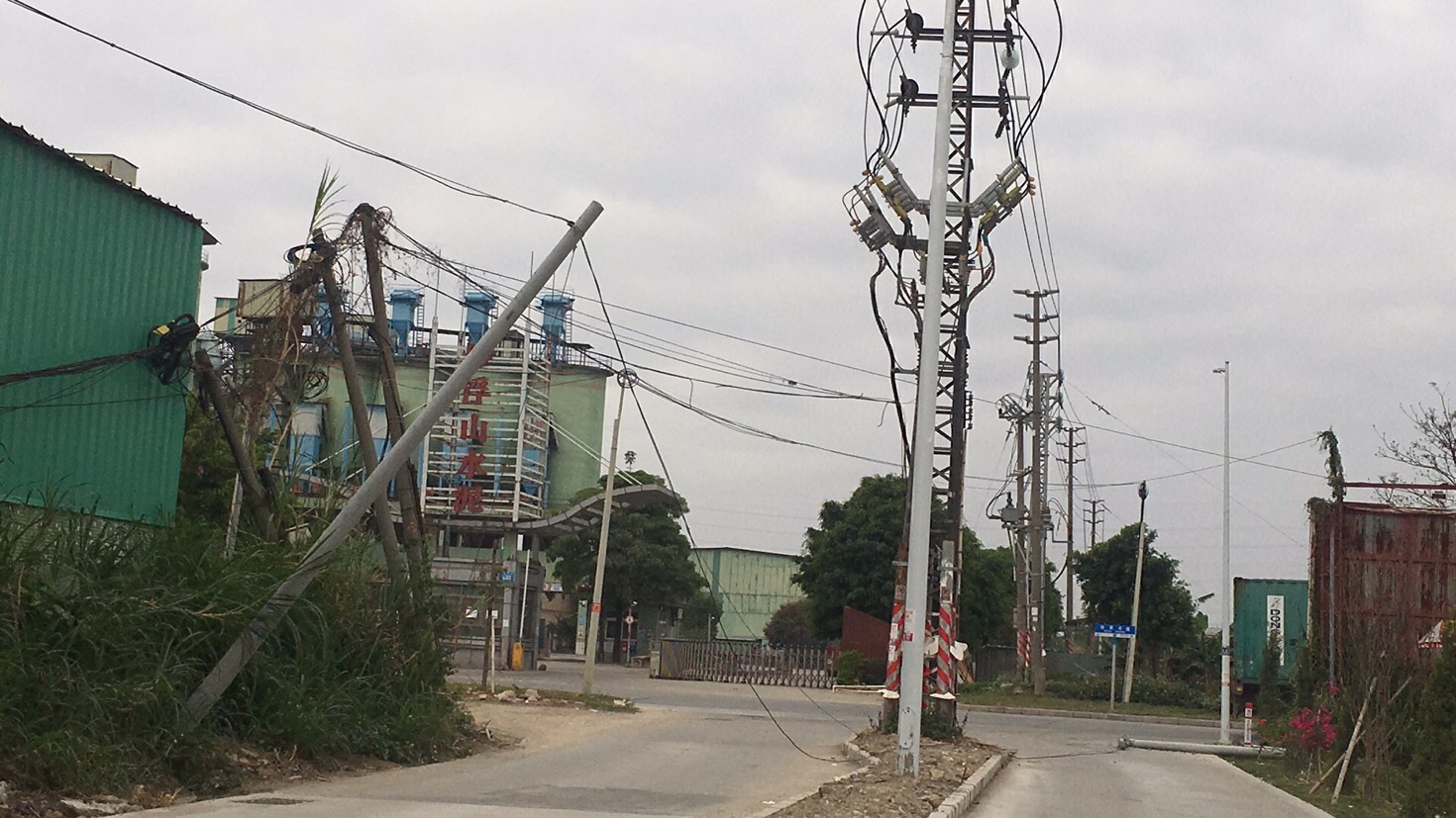 请绕道行驶,另一条水泥线杆严重倾斜,另一条已断随时有可能会倒下。请勿靠近
