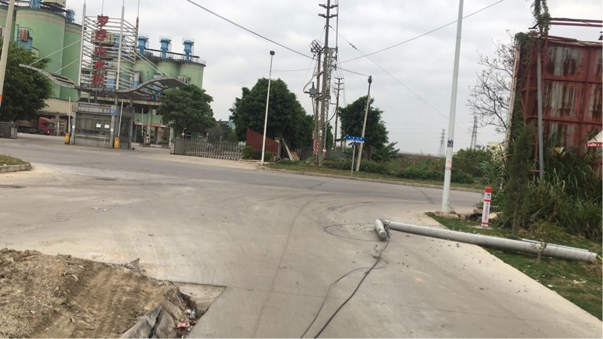 和安大道罗浮山水泥公司斜对面路口,水泥电线杆断了。