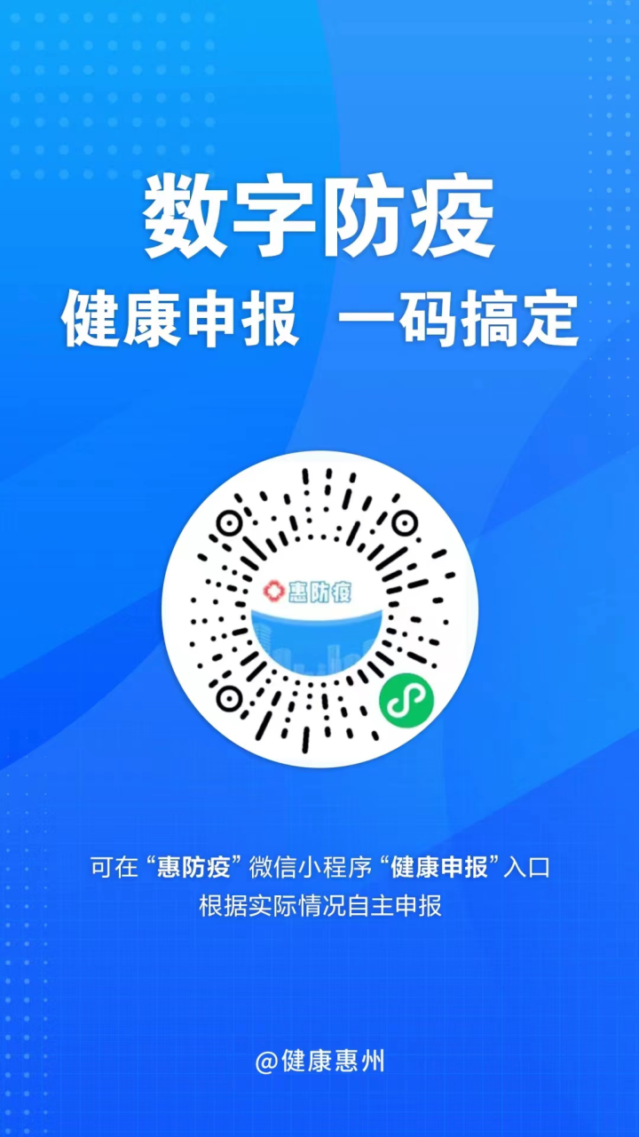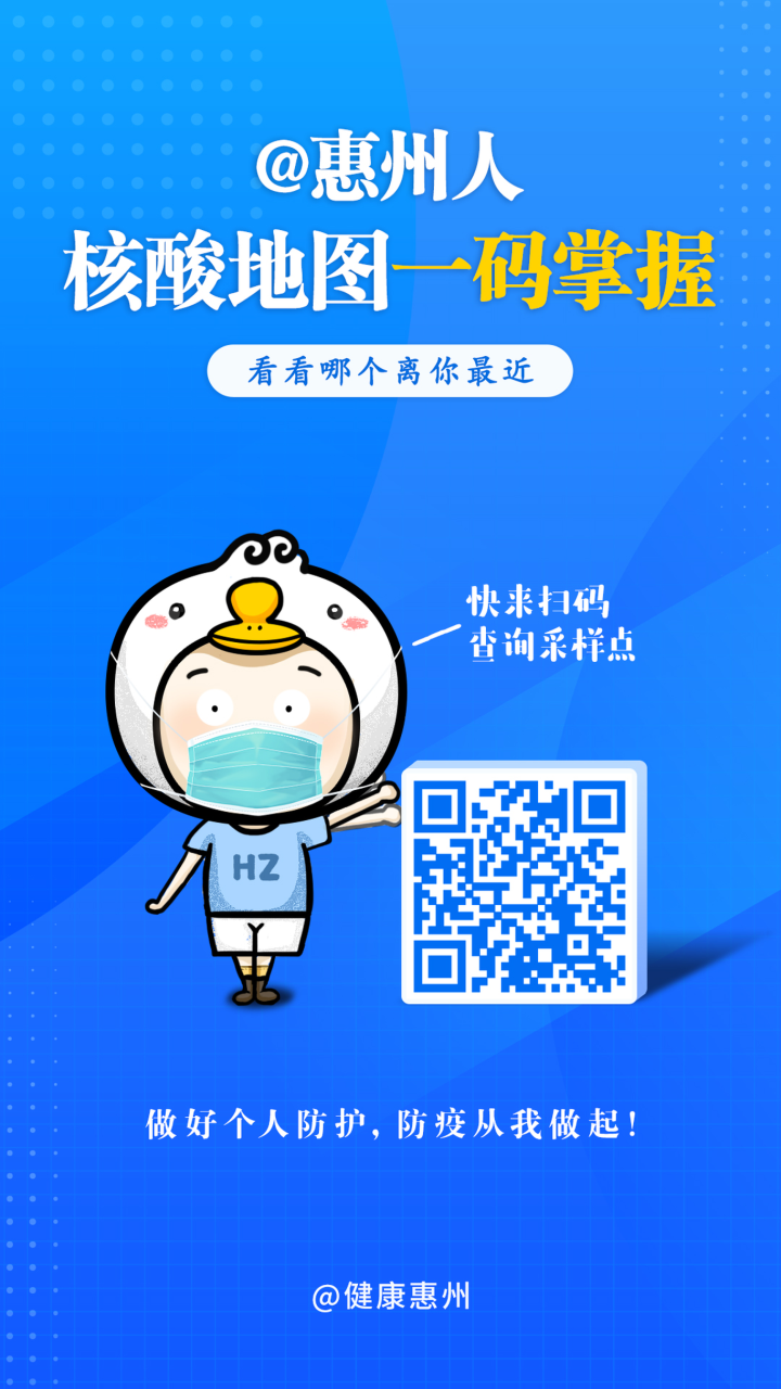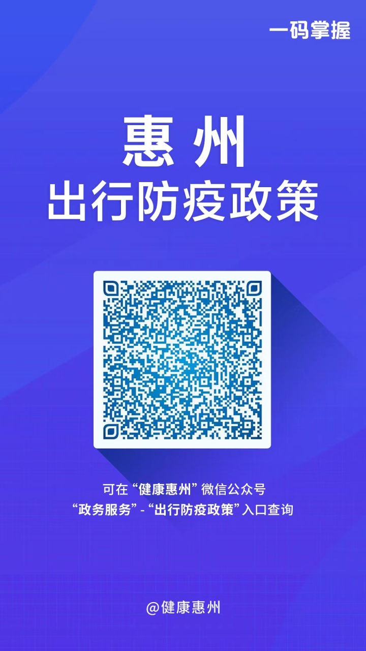 (点击图片可放大查看) 疫情防控,人人有责。 请大家做好个人防护,积极配合, 共同打赢疫情防控这场硬仗! 以下“三码”请收藏关注, 一键查询惠州出行返回防疫政策、 核酸检测点、健康申报等信息。