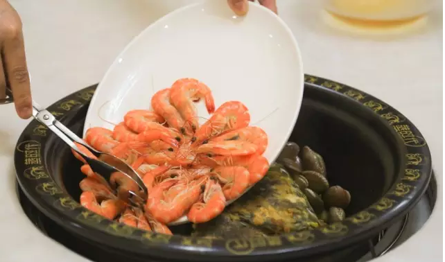 扇鸡铺底,水库大鱼头作为鲜味的基础,倒上鲜鲍、花甲王、对虾和冬蟹…