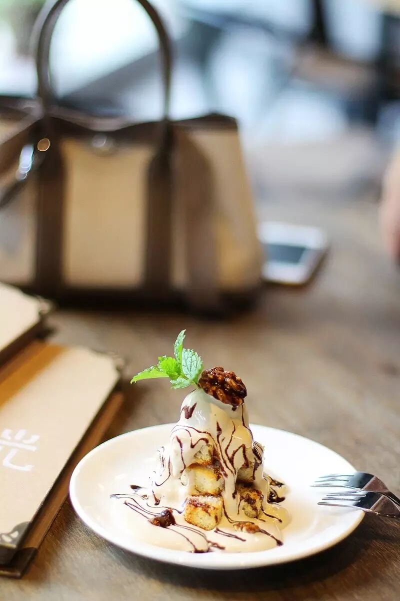 小编记得是招牌哦?点了一份小的,还有大的可以选,这样很贴心,如果一个人来看书的话点一份这个刚刚好,用黄油烤过的小土司,浇上还未完全打发的奶油,再配上咖啡糖浆,还有焦糖核桃,真的是非常完美,焦糖核桃太好吃了,简直是点晴作用,这道甜点一点都不会过甜,超级推介的!咖啡的味道明显又不会过重,整个下午舌头的味蕾都浸满咖啡的香味