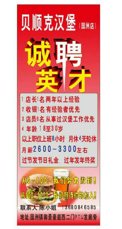 贝顺克汉堡(园洲店)诚聘英才: