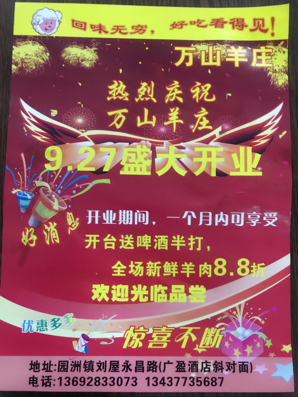 好消息好消息(万山羊庄)9月27日开业,开业期间8,8折,送啤酒半打,优惠多多,欢迎新老顾客光临![咖啡][咖啡][咖啡]地址是:园洲刘屋永昌路广盈酒店斜对面…