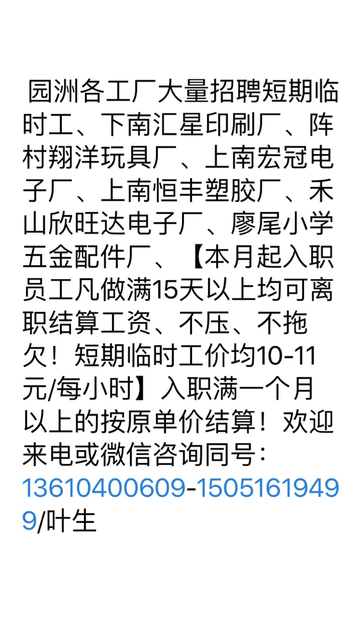 园洲短期、长期临时工招聘、工资可月结!