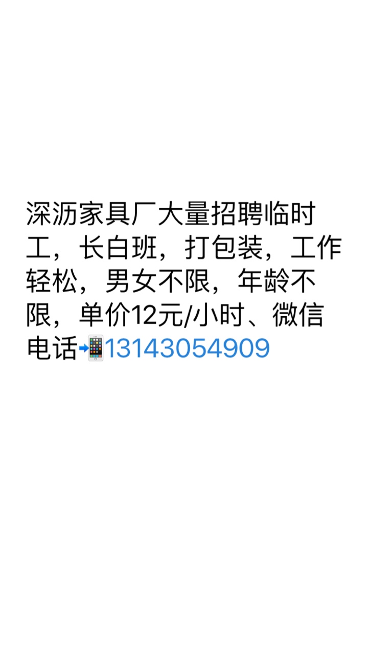 深沥家具厂招打包装临时工多名11-12元/小时