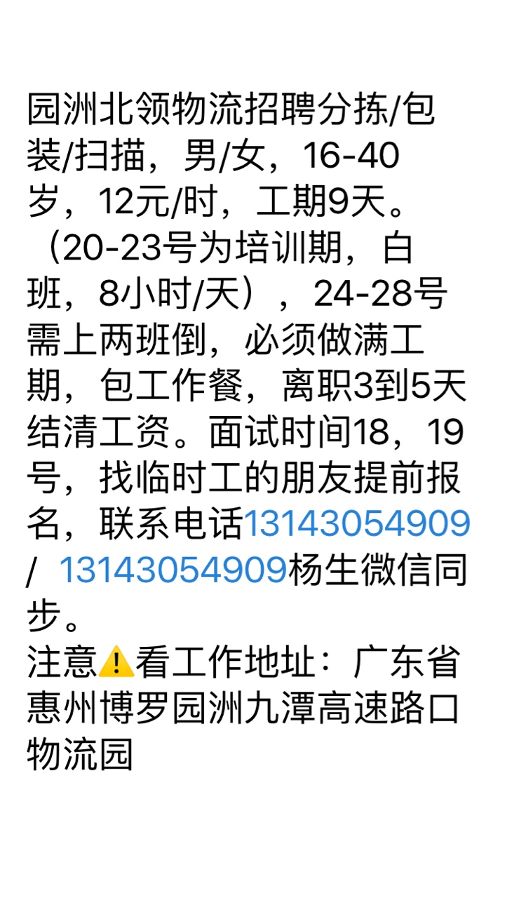 九潭物流园招聘10天短期临时工、16岁以上的进