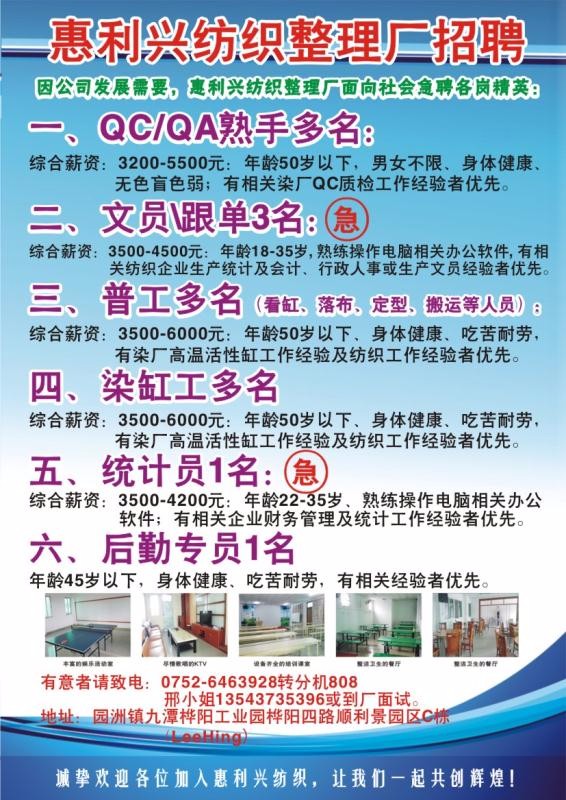 纺织厂急招大量文员,普工。。。包吃包住,有稳定足够订单不愁无事做,有意请联系