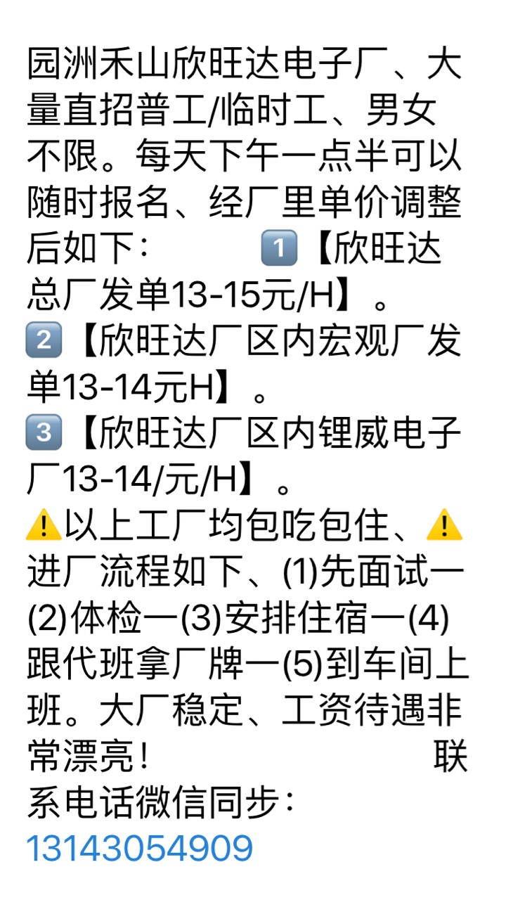 园洲禾山电子厂大量招聘临时工