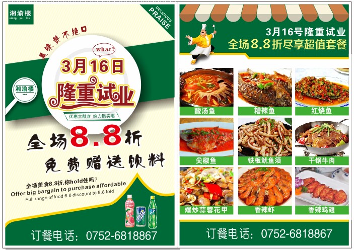 好消息,好消息,湘渝楼开饭啦,3月17号至3月24号试业期间,全场菜品8.8折,消费满200元减50元还送饮料,招牌菜酸汤鱼,有小锅68元,中锅88元,大锅108元,还有各种鱼,干锅,铁板,水煮和各种精美小炒,本店经营正宗湘菜,川菜,海鲜,家常火锅,本店承诺新鲜食材,无任何添加剂,绿色食品,所有菜品保证质量,价位适合各消费人群,同时承接各类宴会聚餐,环境精致典雅,活动时间3月17号到24号地址 园洲镇上南村园洲大道2116号,湘渝楼欢迎各位朋友来品尝