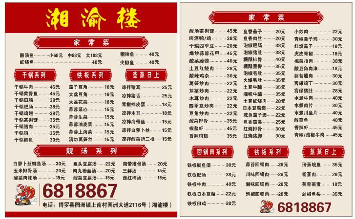 好消息,好消息,湘渝楼开饭啦,3月17号至3月24号试业期间,全场菜品8.8折,消费满200元减50元还送饮料,招牌菜酸汤鱼,有小锅68元,中锅88元,大锅108元,还有各种鱼,干锅,铁板,水煮和各种精美小炒,本店经营正宗湘菜,川菜,海鲜,家常火锅,本店承诺新鲜食材,无任何添加剂,绿色食品,所有菜品保证质量,价位适合各消费人群,同时承接各类宴会聚餐,环境精致典雅,活动时间3月17号到24号地址 园洲镇上南村园洲大道2116号,湘渝楼欢迎各位朋友来品尝