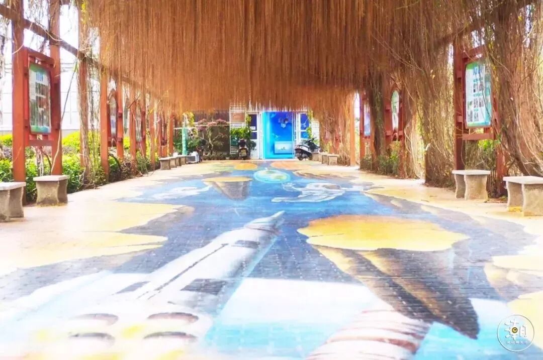 爬满长廊的是锦屏藤,她有一个很雅致的名称,叫“一帘幽梦”。她的气根细长,最长可达3米。为我们形成了一个天然的遮阴棚。在长廊两侧悬挂的展示牌,主要展示农作物品种、航天品种、健康饮食的科普小知识。