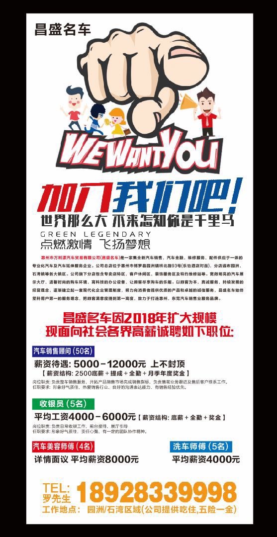 高薪诚聘汽车销售顾问,底薪2500,加高额提成,工资不封顶,加入我们,年薪百万不是梦。公司提供吃住,统一培训上岗。工作地点: 园洲,石湾镇区。