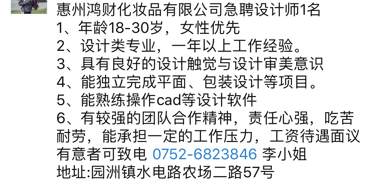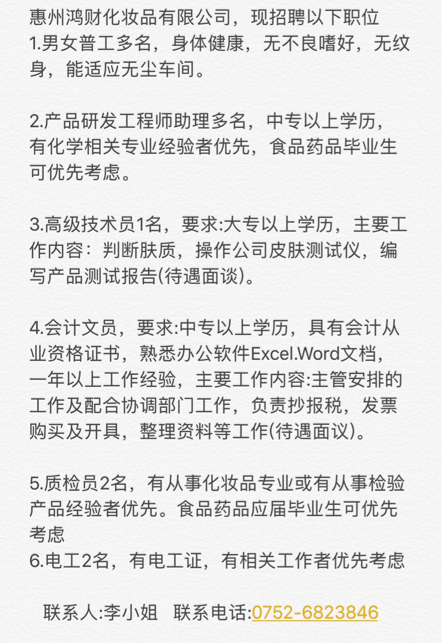 惠州鸿财化妆品有限公司招聘