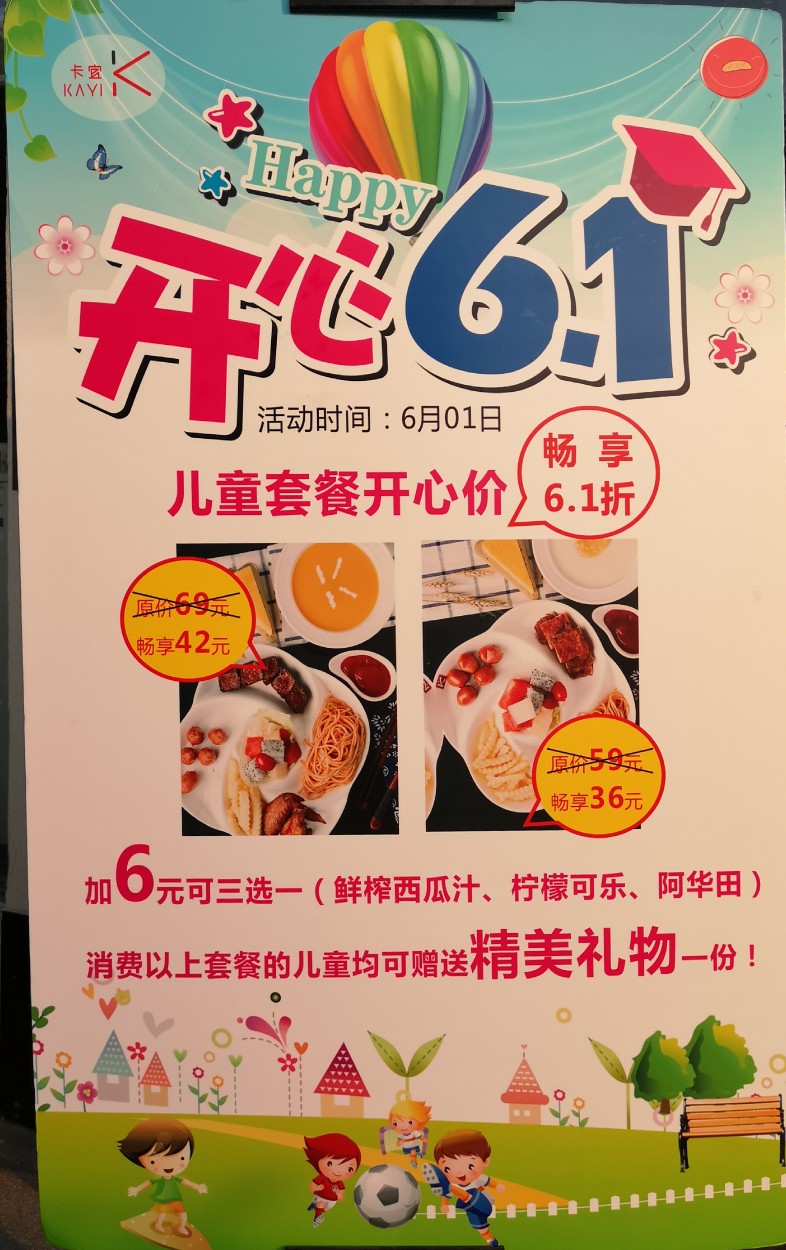 六一儿童节,卡宜儿童节套餐6.1折啦,现场小丑全程陪同您的小孩玩耍,还有很多精美礼品到店就送哟