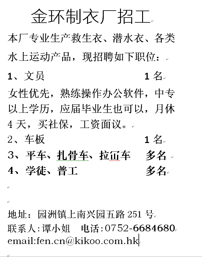 现招实验室助理 1名,有无经验也可;要求:男女不限,工作细心,认真负责;主要协助实验室的工作,进行皮革物理测试,出具测试报告,对实验室内的设备进行保养;