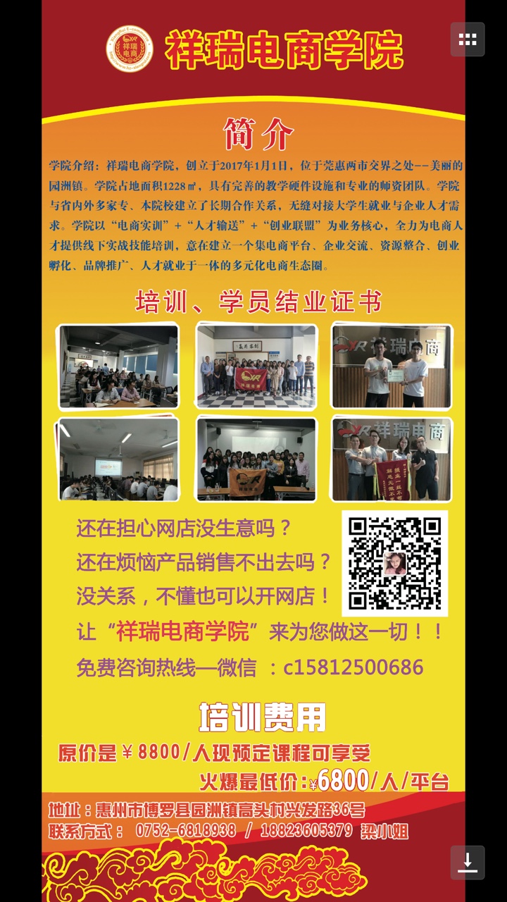 [机智][机智]还在担心网店没生意吗?还在烦恼产品销售不出去吗?没关系,不懂也可以开网店!让“祥瑞电商学院”来为您做这一切!!免费咨询热线,——微信 :c15812500686