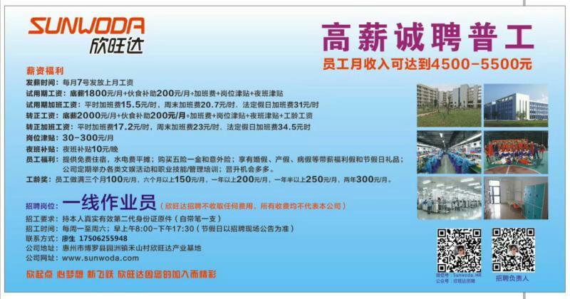 一、1、招聘岗位:大量招聘作业员、物料员、生产文员,生产领班、品检员、品质QC、SMT技术员,等职位 2、招聘条件: 性别: 男女不限、学历:初中以上文化程度. 证件: 持本人有效身份证、一寸相片两张. 复印件三 张。 其他要求: 无纹身、如明显刀疤、服从管理。 二 薪资待: 每月7号发放上月工资,只压7天 作业员:1: 试用期之内 正常上班21.75天, 底薪1800、平时加班1.5倍, 星期六星期天加班 2.0倍 , 法定节假日加班3.0倍 既: 星期一到星期五晚上加班每小时:15.5元 星期六星期日全天算加班每小时20.7元 法定节假日加班每小时31元 2: 试用期后: 底薪为2000 平时加班1.5倍 星期六星期日加班2.0倍 法 定节假日加班3.0倍 既:星期一到星期五晚上加班每小时17.2元 星期六星期日全天算加班每小时23元 法定节假日加班每小时34.5 元 三: 其他福利待遇, 每月享有生活补贴200元 如上夜班:享有夜班津贴每晚10元 岗位津贴:视岗位而定,50一800元不等 生产绩效奖金100一500不等 每月享有全勤奖。 生日奖,,,年终奖,,,五险一金,,等 一线作业员工工资可达4600一6500 四: 上市公司、实力雄厚、晋升空间较大、 有梦你就来,我们给你一个平台,让你的未来更加灿烂, 五: 联系方式:地址:博罗县园洲镇禾山村欣旺达产业基地 联系人:欣旺达招聘组:丁勇 联系电话:134 2292 8161