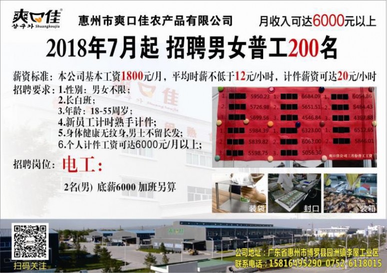 爽口佳农产品有限公司现招聘普工200名!