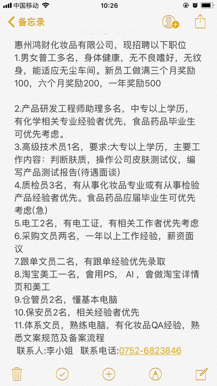 体系文员,熟练电脑,有化妆品QA经验,熟悉文案规范及备案流程,有需要找工作的朋友们请看以下对应职位,有意者请联系