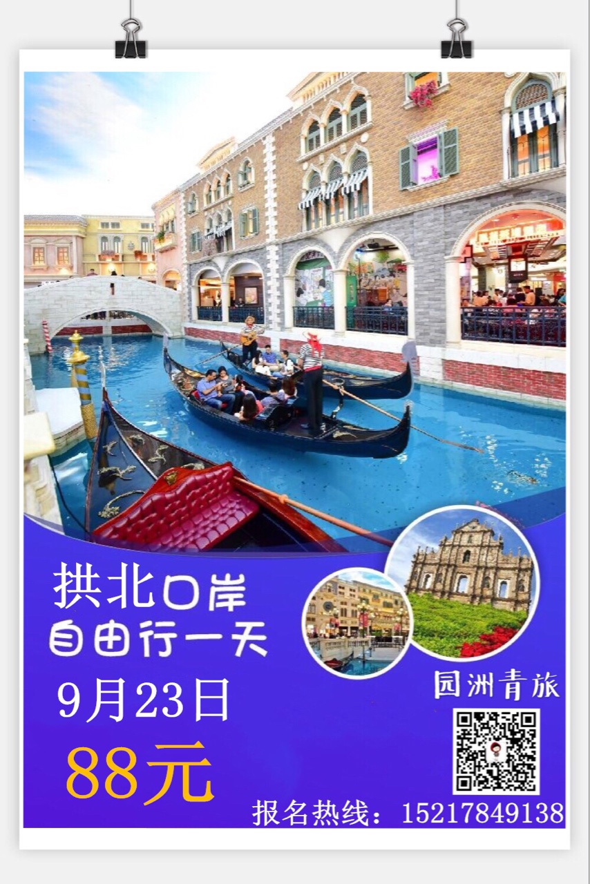 9月23日园洲出发澳门自由行一天游88元[耶]自由支配游览时间,尽享自由行乐趣。报名热名惠州青年国际旅行社园洲门市部0752-6388315/15217849138(微信同步)