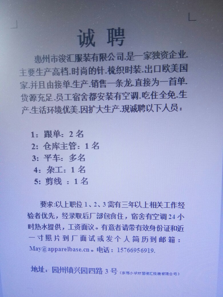 制衣厂诚聘以下职位