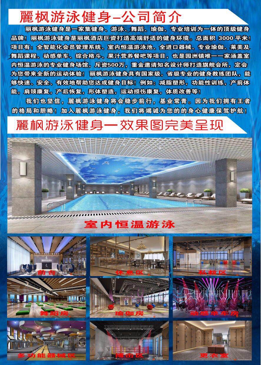 麗枫游泳健身是园洲丽枫酒店斥资500万打造的高端舒适游泳健身俱乐部,整店拥有3000多平米,包含 室内四季恒温游池、全进口器械、瑜伽、舞蹈、动感单车、搏击、少儿培训、汗蒸等现在预存50元办卡立减1000元,如对卡价不满意50元无理由退还,扫他微信立即预定名额!(另招聘会籍顾问10名 13755065059李)