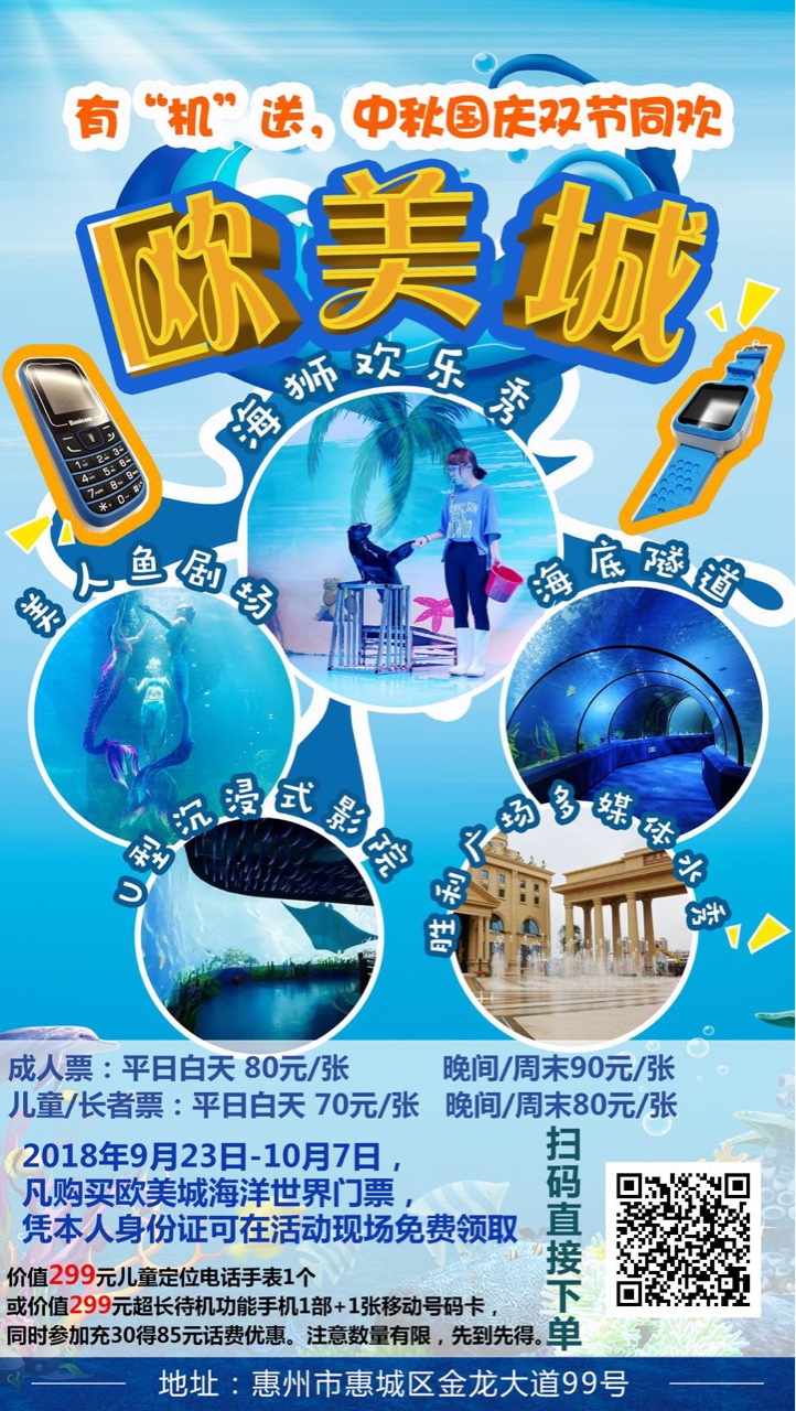 惊喜!惊喜!惊喜!2018年9月23日-10月7日,凡购买欧美城海洋世界门票,凭本人身份证可在活动现场免费领取价值299元儿童定位电话手表1个或价值299元超长待机功能手机1部+1张移动号码卡,同时参加充30得85元话费优惠。请注意数量有限,先到先得。[奸笑]点击长按图片里的二维码识别就能下单购买
