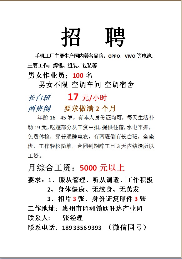 长期招聘,17-28元每小时,电子厂,美女多多,帅哥多多,赚钱轻松!包吃包住,工作高,月收入5000+以上,联系电话189 3356 9393 张生