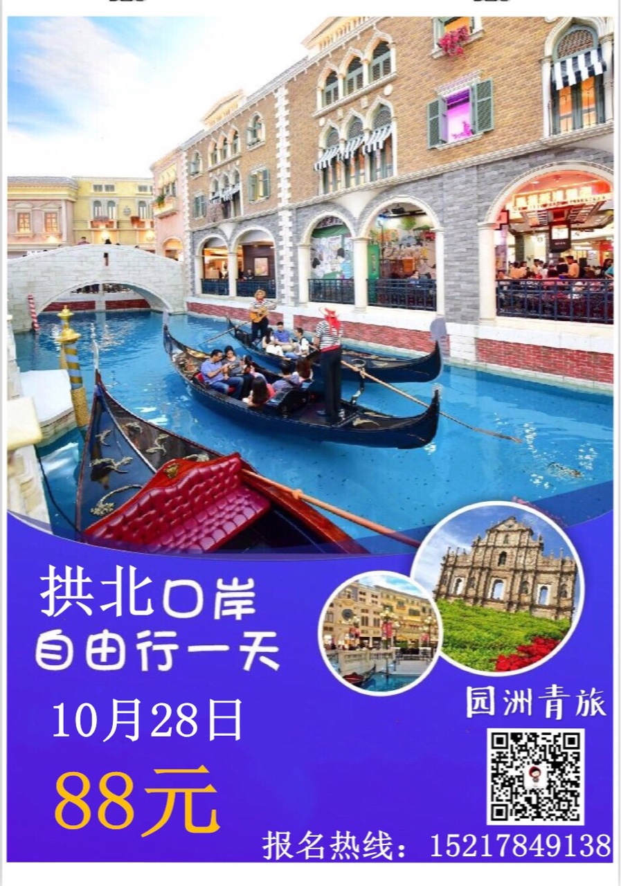 10月28日【澳门自由行】拱北口岸往返88元园洲上车[耶]自由支配游览行程时间,尽享自由行乐趣。报名热线15217849138(微信同步)