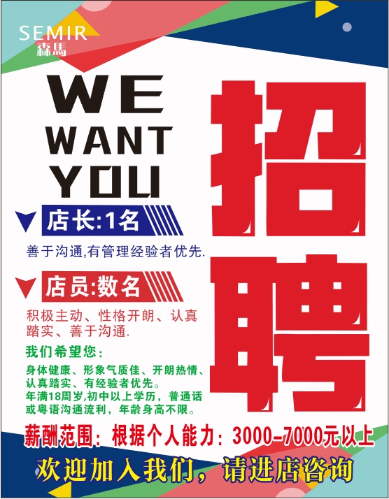 位于园洲镇新三新商场内的知名品牌服装森马服饰高薪诚聘以下职位