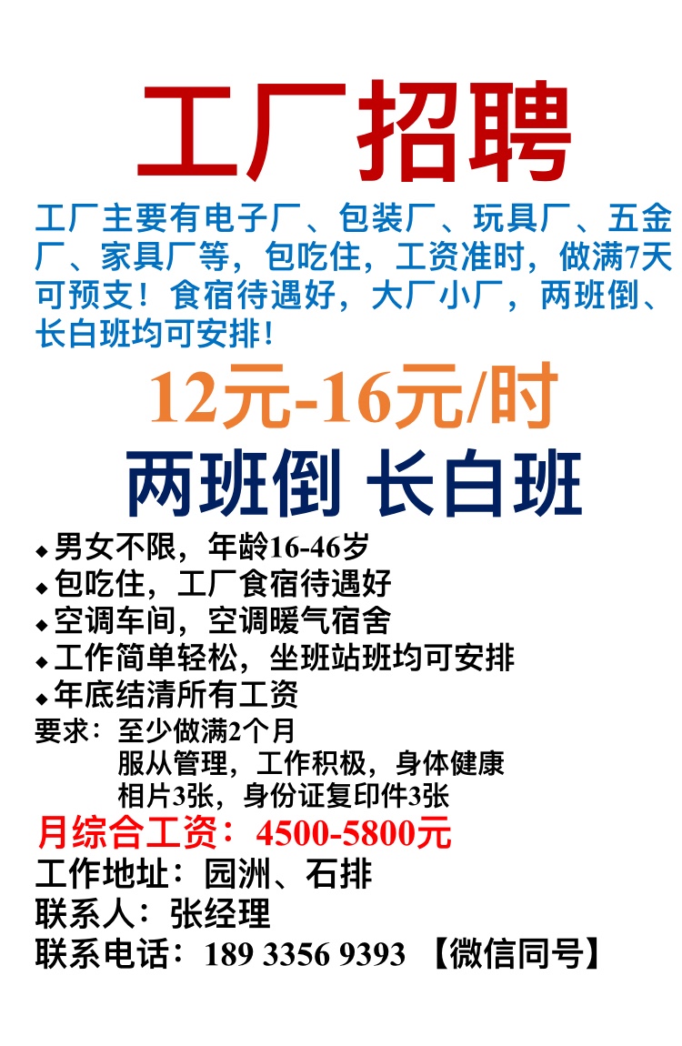 工厂招聘大量临时工,工资准时,过年结清所有工资!