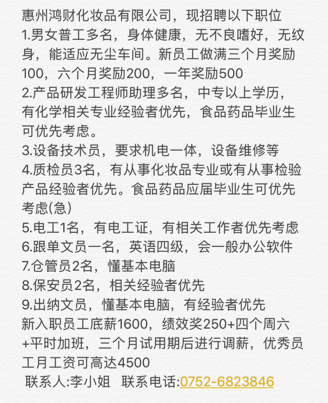 急招出纳文员,保安员等