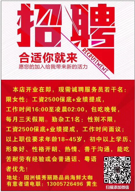 园洲镇秀丽路品尚海鲜大咖招聘服务员若干名:性别:女;工資2800业绩提成,工作时间16:00至凌晨02:00,包吃晚餐,每月三天假期。勤杂工1名:性别不限工资2500保底业绩提成,工作时间面议;以上职位要求年龄18-45岁,初中以上学历、形象好、性格开朗、热情、善于沟通,能吃苦耐劳有经验或会普通话粤语者优先。