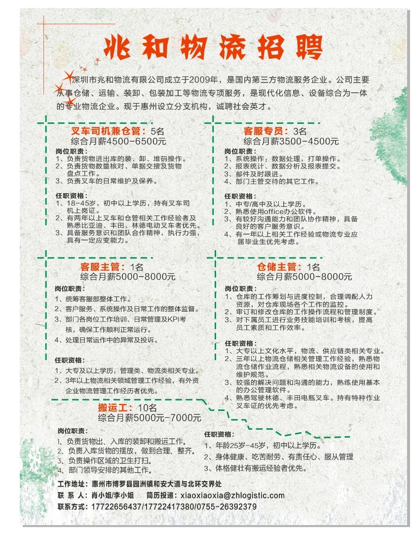 叉车司机、客服专员、客服主管、仓储主管、搬运工