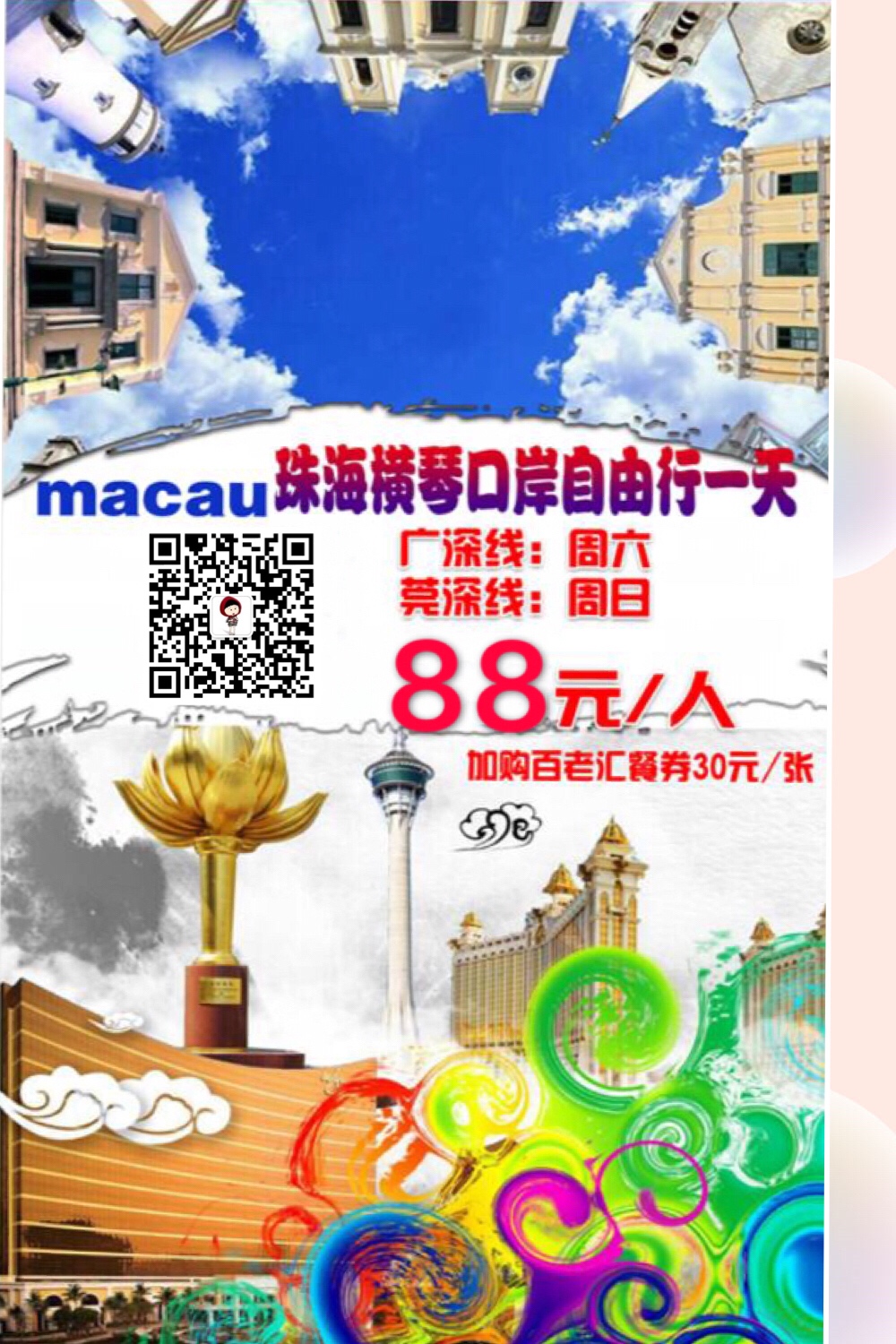 去澳门感受浓浓的圣诞气氛吧12月23号珠海横琴口岸自由行一天只需88元[色]报名热线惠州青年国际旅行社园洲门市部15217849138(微信同步)