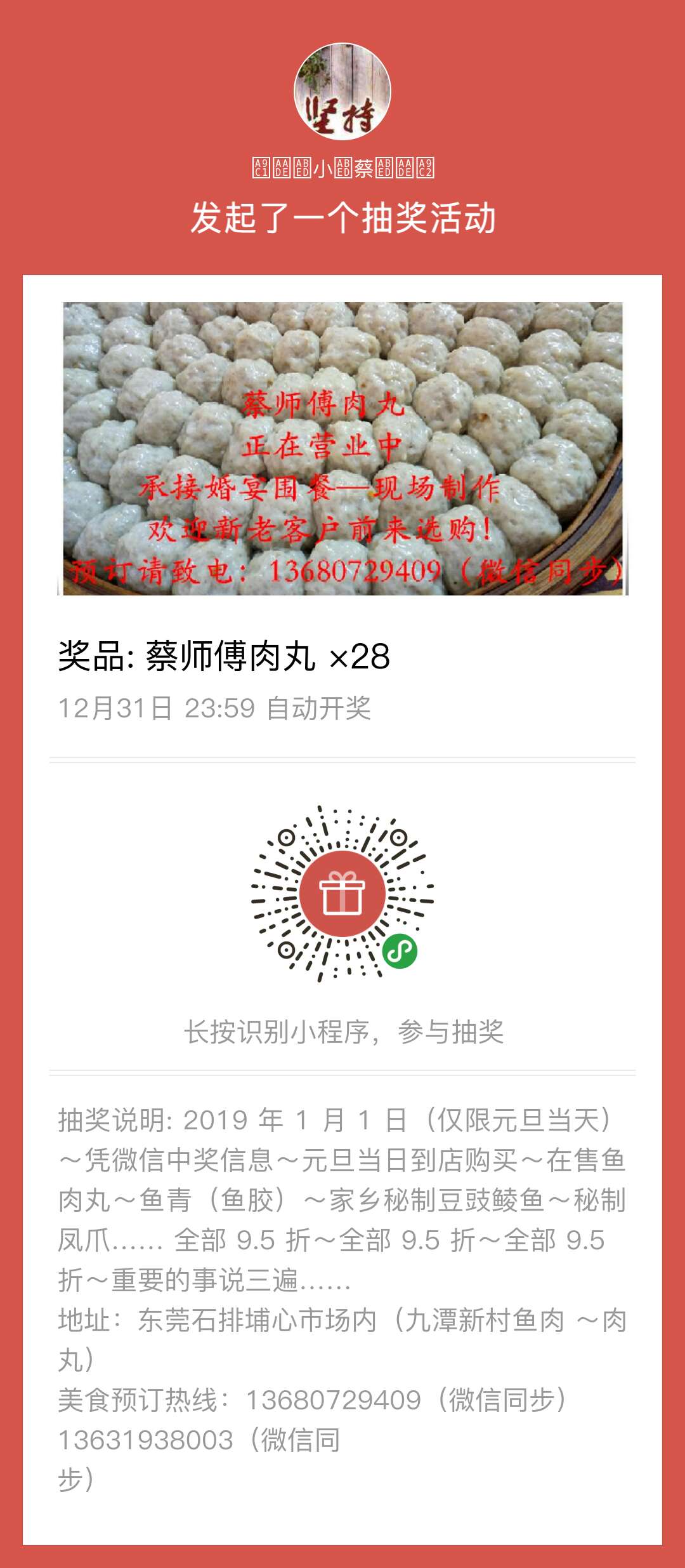 蔡师傅肉丸为感谢新老客户的支持~特举行一个小的抽奖活动~感兴趣的朋友可以积极参与(只要长按图片红色抽奖标志即可)~祝参与的朋友好运~新年中大奖!
