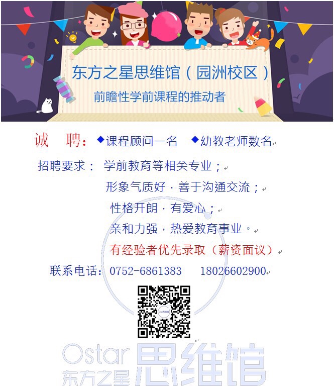 工作地点:园洲花园北1门二楼东方之星幼儿思维训练馆(园洲校区)