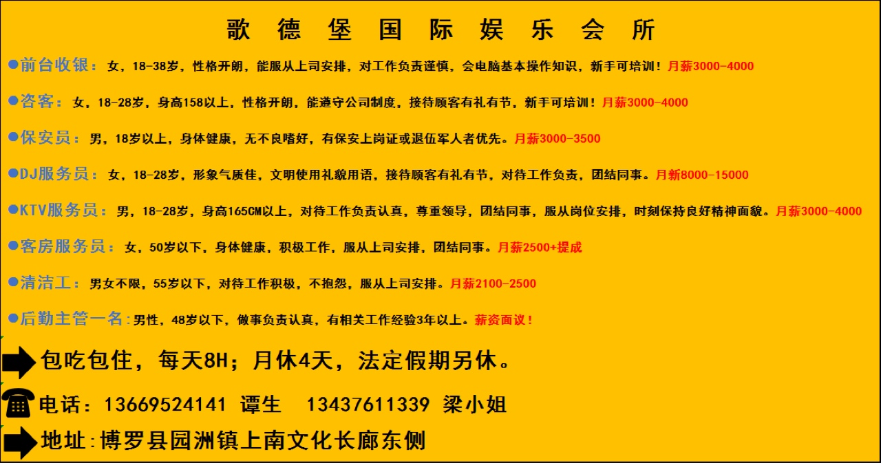 歌德堡招聘收银员,咨客,保安员,楼面服务员,客房服务员
