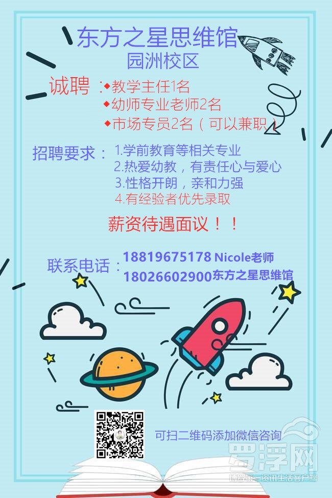 工作地点:园洲花园北1门二楼东方之星幼儿思维训练馆(园洲校区)