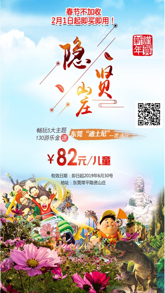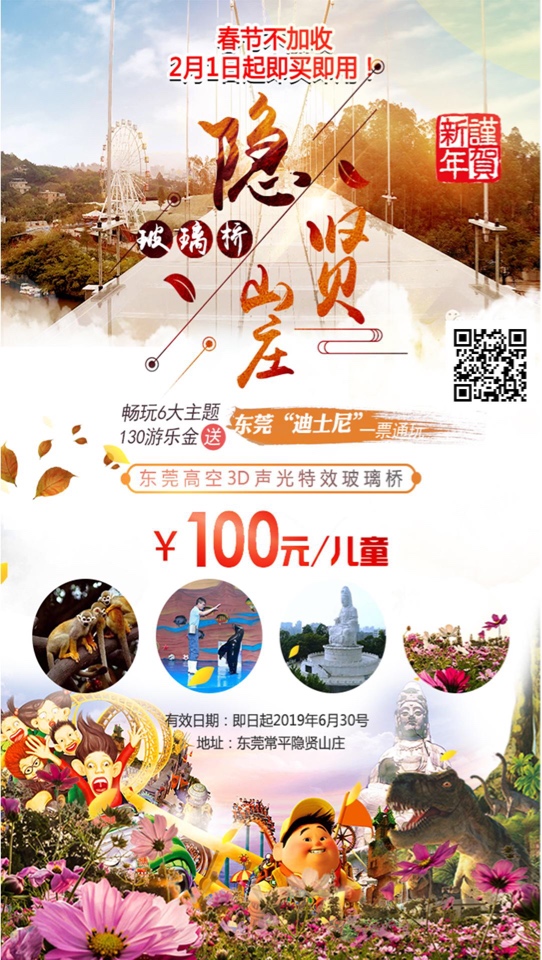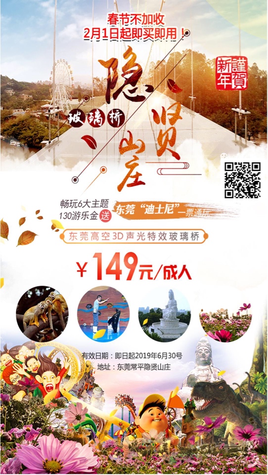 [即买即用·节假日不加收]【东莞·隐贤山庄·B套餐】3D开裂网红玻璃桥!149元~畅玩六大主题通玩:玻璃桥+亲亲动物园+快活谷大舞台+萌宠剧场+3D花海+礼佛+加赠130元游乐金