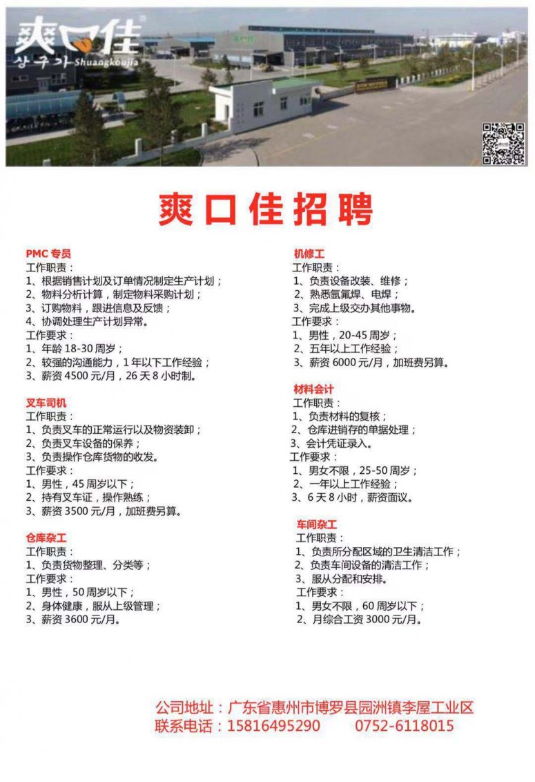 PMC专员、机修工、叉车司机、材料会计、仓库杂工、车间杂工