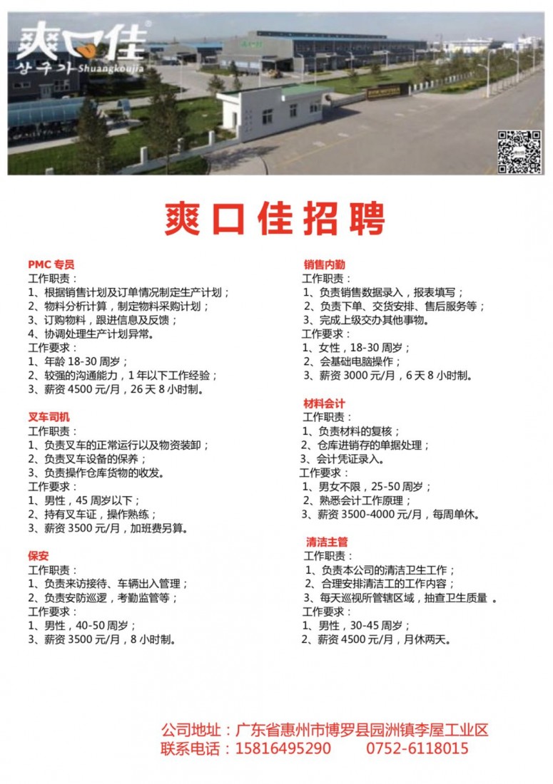 PMC专员、销售内勤、叉车司机、材料会计、保安、清洁主管