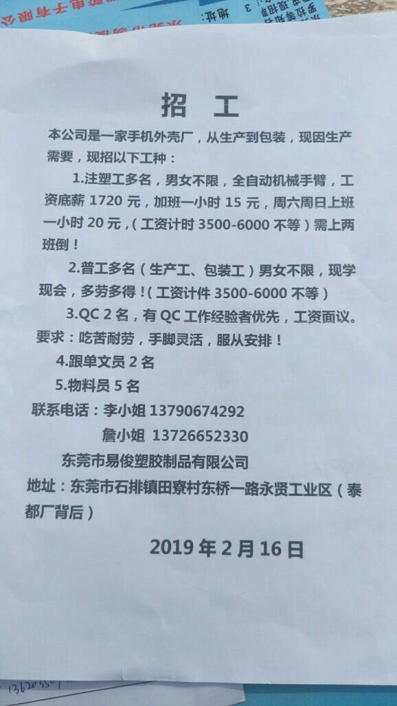 【公司招聘】招部分男工,18-40岁,有意者回复本人13723513319