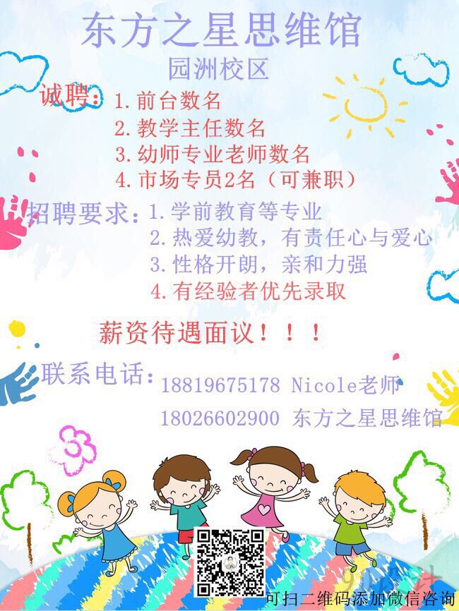 任职要求:有责任心!爱孩子!有耐心!有一颗不甘落后的上进的心![愛心]只要有能力别问我薪资待遇你的工资待遇你说了算[奮鬥][奋斗][奋斗]