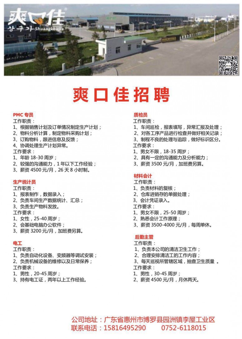PMC专员、质检员、生产统计员、材料会计、电工、后勤主管