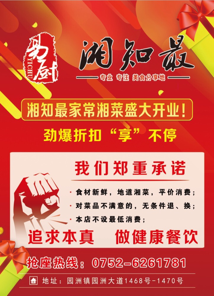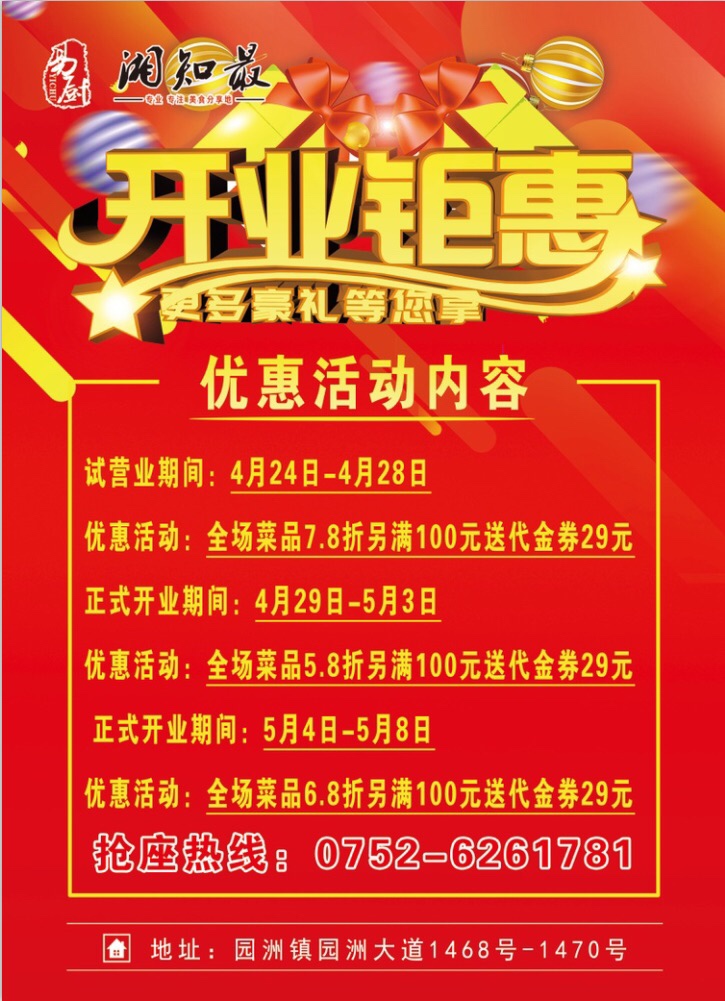 湘知最时尚餐饮园洲店四月二十九日盛大开业,开业期间全场菜品5.8折,另消费满一百元送29元代金券一张,优惠折扣享不停,欢迎各位前来指导工作[抱拳][抱拳][抱拳][咖啡][咖啡][咖啡]