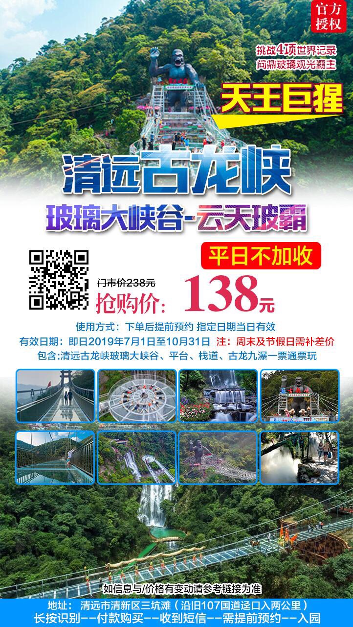 【清远·古龙峡】限时抢购138元畅玩古龙峡玻璃大峡谷-云天玻霸天 【天王巨猩】项目,超长329米玻璃大峡谷玻璃桥+悬空16.8米的玻璃观景台,假期无忧,刺激有趣又抵玩!点击长按图片里的二维码识别下单购买吧[奸笑]